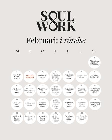 Februaris kalender är en daglig manifestation av rörelse. Kroppen är ditt tempel, rörelse din bön och själen ditt altare. Ställ in kompassen med oss inne i klubben. Mantrat ”i rörelse” är en påminnelse om att allt är som det ska. Kanske inte helt enligt dina planer men ibland är det meningen att rida hästen i den riktning den springer! (Kul va nu när vi går in i Höstens år!).